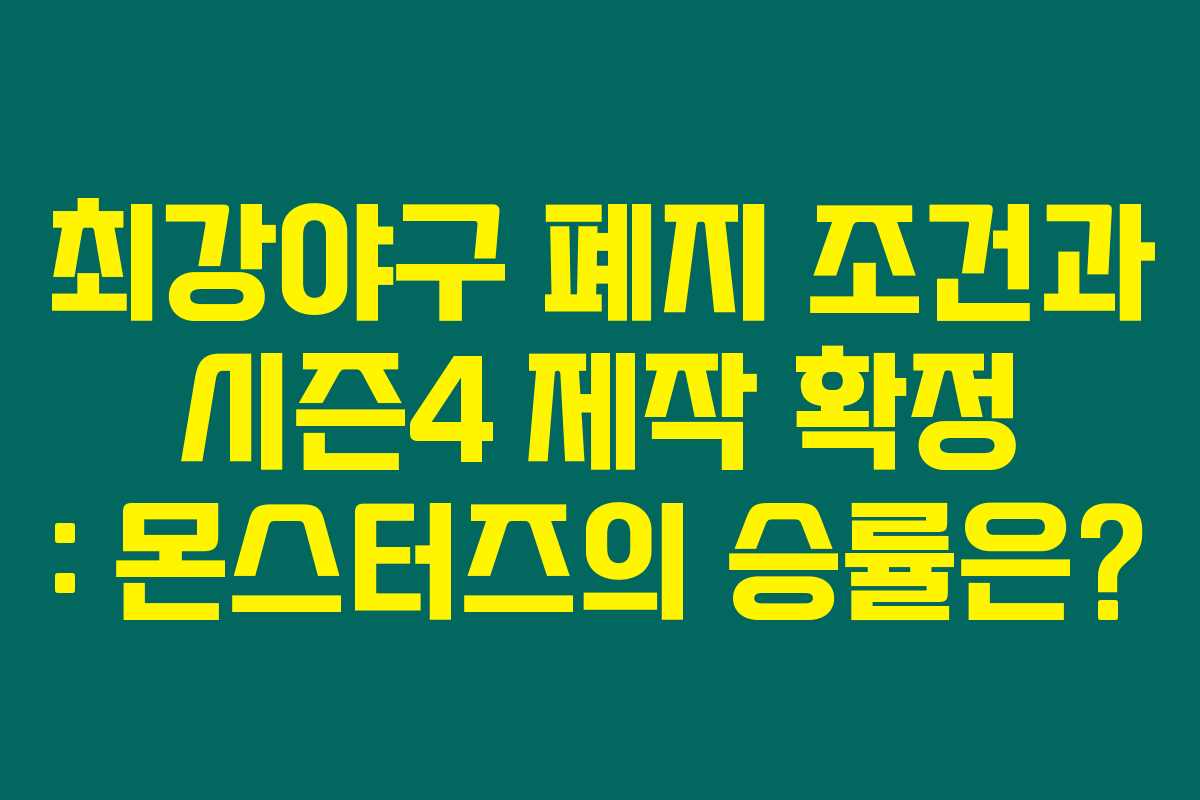 최강야구를 즐기고 계신가요? 만약 최강야구의 존폐 여부에 관심이 있다면 지금부터의 내용을 주목해 주세요. 최강야구가 폐지될 조건은 무엇인지 그리고 시즌4 제작 확정을 위해 몬스터즈가 몇 승을 남겼는지 궁금하신 분들 많을 거예요.